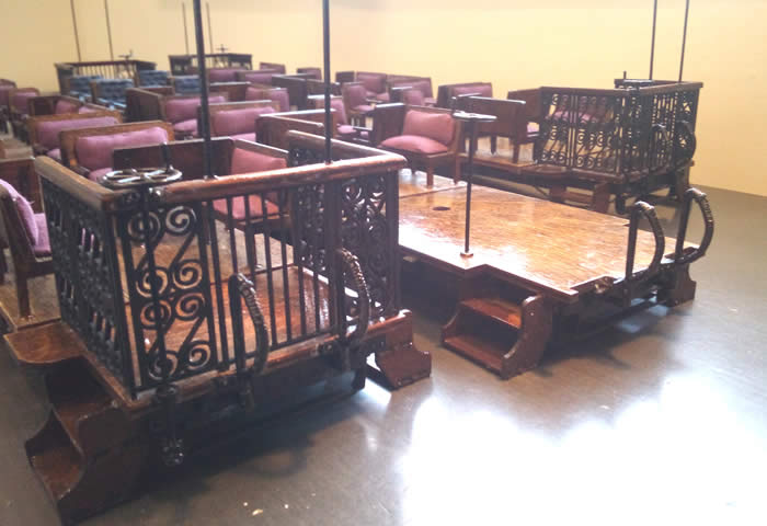 The seats were covered in foam and old maroon bedsheets. I drilled and put rivets in to make the buttons.