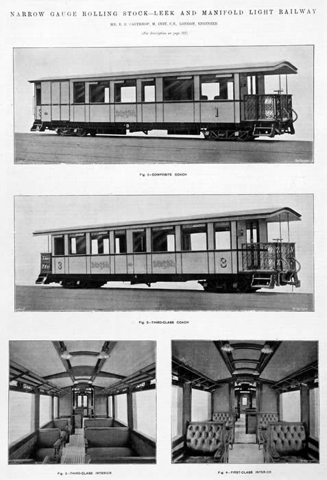 The carriages designed by Calthrop were the largest and most luxurious ever used on a British narrow gauge railway. All were open saloon vehicles with bogies and centre gangways. They were constructed by the Electric Railway and Tramway Carriage Works Ltd of Preston. There were two third class opens and two first/third brake composites. They featured a pitched roof, decorative leaded opening toplights, ornate wrought iron panels to the end balconies and "L&MVR LtRy" scrolled on the sides. They were originally painted primrose yellow.
