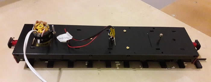 Meanwhile, despite numerous e-mails, communication from the Indian company stopped, and I began to lose interest in the project. An inspirational ‘phone call from my Dad encouraged me to keep going, and a pair of bogie kits were ordered from Swift Sixteen. The kits were soon painted and assembled, and the bogies were fitted to the chassis, with a large square hole being cut in the front of the footplate for the motor. I used 5mm thick acrylic discs fitted between the footplate and the bogies to allow them to pivot.