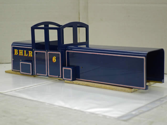 The front and rear radiators were challenging to make, as they have a rounded edge on 3 sides, and it was crucial to have 8mm radius corners to match the curves on the bonnet. A few methods were tried, including 3D printing, but the final solution was to make the panels from MDF. The edges to be profiled were routered with a suitable round-over bit. The next task was to apply wasp stripes to the panels, and although I tried to do the job myself, it proved too difficult and the parts were sent to Matt Towell at Barley Pit Works. He did a super job and once the parts were returned, I drilled a hole for the front headlight and glued the bezels into place. Now that most of the work on the superstructure was done, I decided that it was time to have the loco painted. This was done by an automotive painter who uses 2-pack car paint, and the finish is excellent. The superstructure parts were then handed over to Geoff Munday for lining, and needless to say, they came back beautifully lined in the same livery as the prototype. Geoff also applied custom decals which were supplied by CB Transfers.