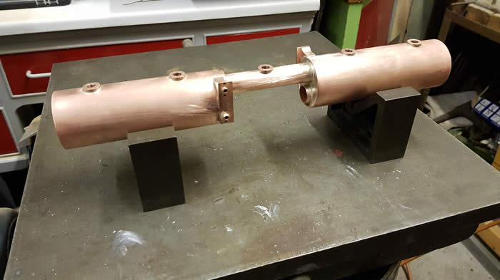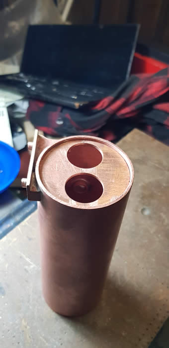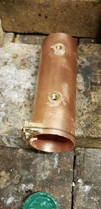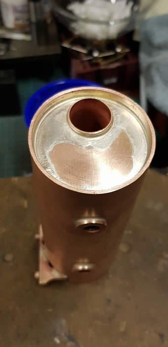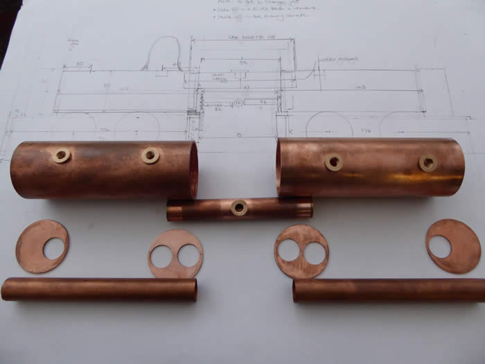 First make all the parts. 2" copper tube for the barrel and 19mm for the flue tubes. 16 gauge for the ends and boiler joining tube which has baffle plates in each end to help prevent water sloshing through when the engine has to start quickly because the regulator will be open and priming might take place. When stopping this will not occur because the regulator will be closed.