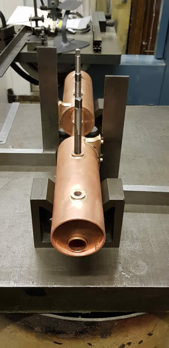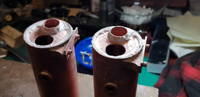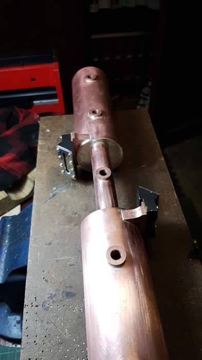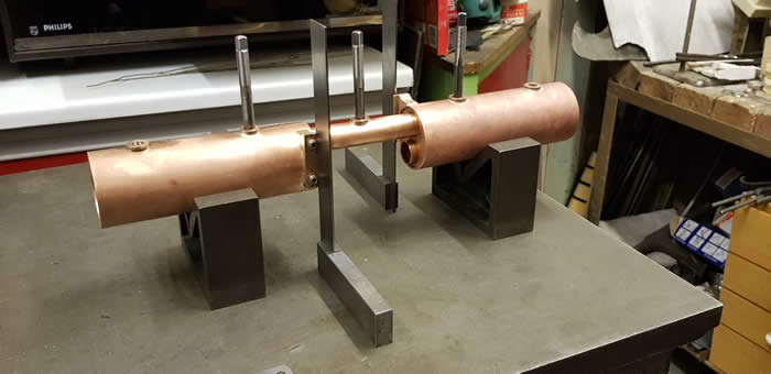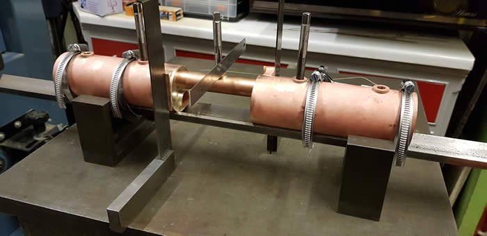 Trev devised a system whereby the two boilers are held in a piece of angle with Jubilee clips for support. All square and ready to be soldered.