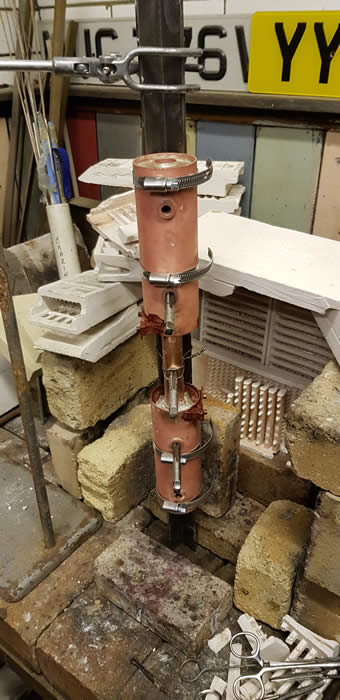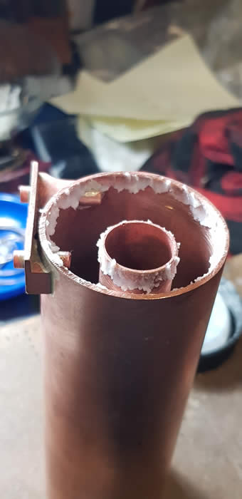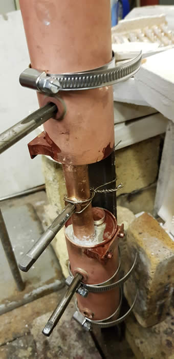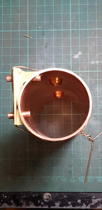 The first picture shows the gauge support wired in place and the through copper tubes. The second shows the bushes and gauge support fluxed in position ready for the higher melting point solder.