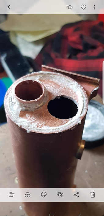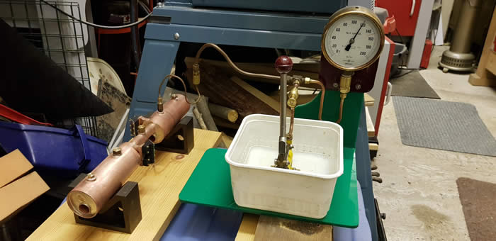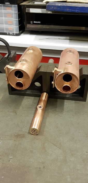 The basic design has two of everything. two boilers; two water gauges; two Goodall fillers, two safety valves, two burners, two gas tanks and two gas valves, two lubricators, but only one regulator and pressure gauge. Here you can see the baffles in the joining tube.