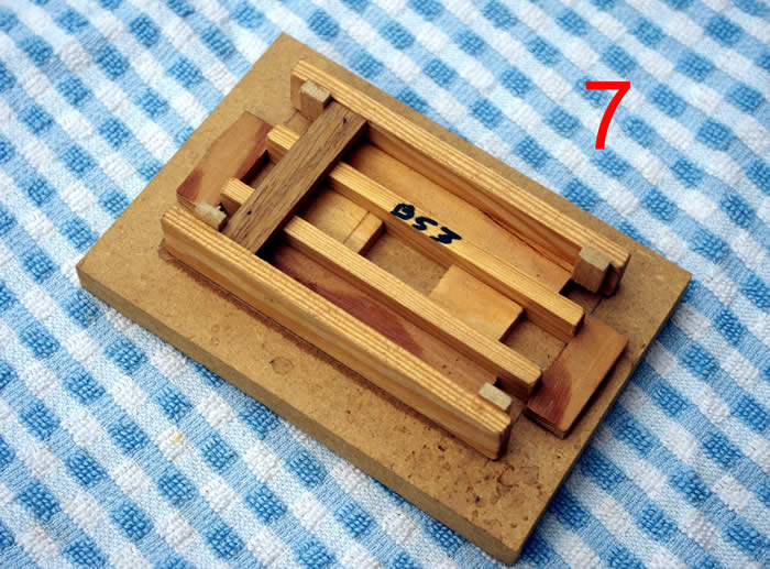 Photo 7 shows the chassis jig, the solebars (one marked B53) are held in place by four loose packing pieces between the fixed stop blocks on the outside. One plank has been positioned showing how they sit between the outer stop block and the end stop which set the floor length.