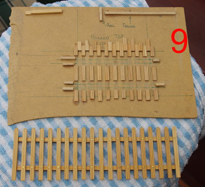 I needed a length of fencing for station platforms. I had a stock of Hobbies 4x2 spruce which I decided to make into picket fencing. A jig was knocked up to make the panels.