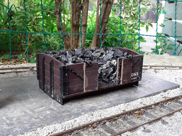 After I completed this article, I looked at the open wagon and thought it looked a little bland. If the body was used as I imagined as a coal store, I doubt the doors would be shut. I gently levered off the black corner strapping this allows the side to be removed. Using a razor saw I cut down the lines that mark out the door cutting through the top catch and hinges. The doors were secured in the open position using a black grab adhesive and the white cut edges disguised with sleeper grime paint. A healthy pile of coal was arranged and PVA and when set coated with patio sealer.