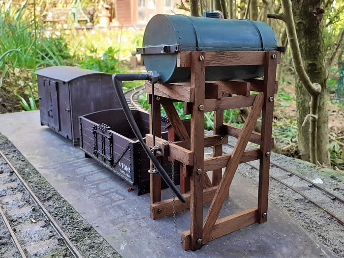 The third wagon was an AnDell tank wagon which again I wasn’t happy with, the resin construction just didn’t sit well with me. The obvious fate for the wagon was to be come a water tower. A rummage through my wood stock (another lockdown task to sort through) turned up some oak strip. A simple four leg braced stand was knocked up deliberately left looking rustic. The joints are glued and through bolted with 2mm stainless bolts. A box and trunk for the water incoming pipe was made from mahogany strip with the feed pipe made from 3mm copper tubing. The delivery pipe is a length of K&S tube with a valve made from a nut, brass rod and a handle from the bits box (Model Earth I think), the bag is heat shrink.