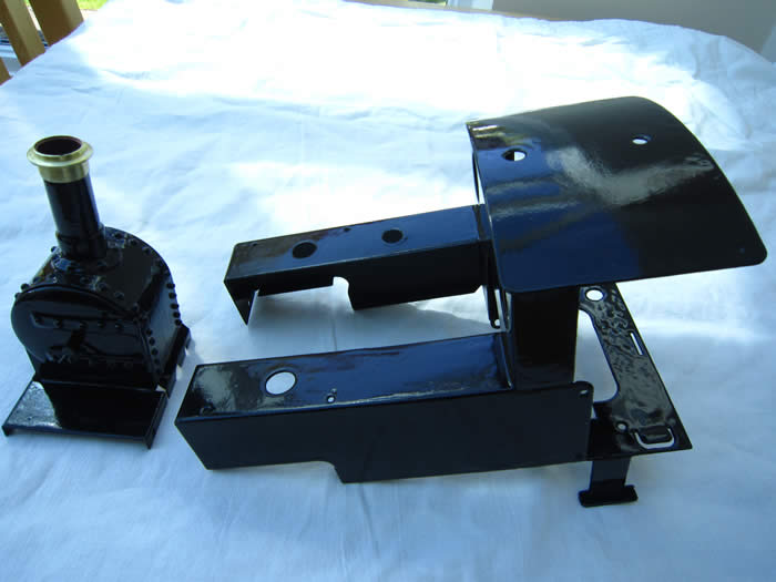 Now to painting. I plumped for BLACK in varying shades. The boiler and diffuser were spray painted in Bar-b-que heat resistant paint, the chassis received a matt satin spray and the bodywork and smokebox black gloss; oh and a splash of cream for the cab back head.