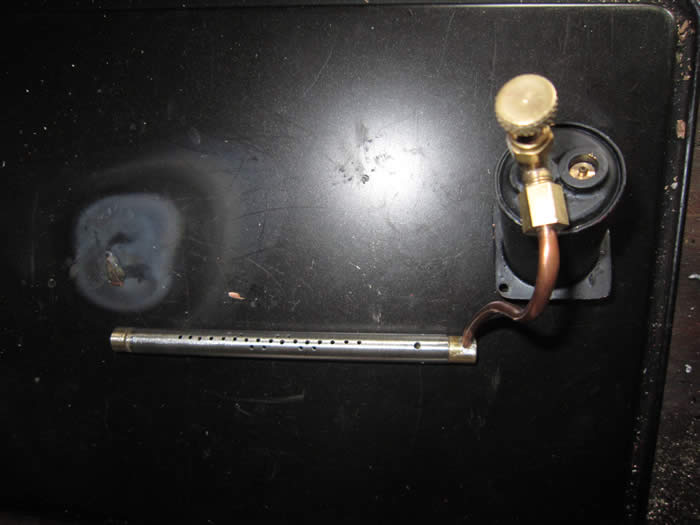 A small gas tank from the spares box was located on the RHS of the cab and a gas pipe and nozzle holder made to pipe the gas to the burner. Trial run of the poker burner was a failure with too much primary air blowing the flame towards the final apertures and starving 50% of the burner apertures. A second burner was made and a row of 15 X 1.5mm apertures with 2 X 1.5mm primary air holes. This was fired up on a steel tray in a jig and the flames were bright yellow tipped, a carburising flame and 50mm high indicating insufficient primary air. The primary air apertures were increased to 2mm and the flames were burning bluish but still with yellow tips about 30mm high. The number of burner holes was increased to 30 with additional holes either side of the centre line midway along the poker. This modification lowered the height to 10 to 20mm high of the flame but with some yellowing at the tips. Finally, 2 extra 1.5mm primary holes were made and the resulting flame was a good all blue colour, indicating a neutral flame had been achieved, this was accompanied by a pleasing low roar, success at last.