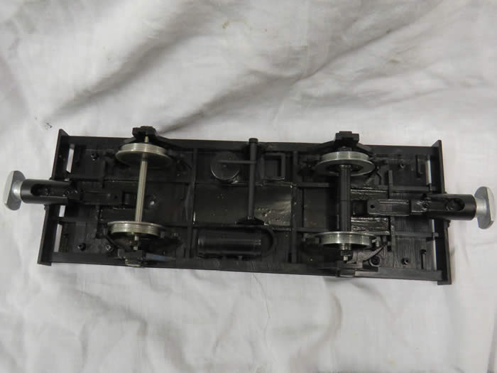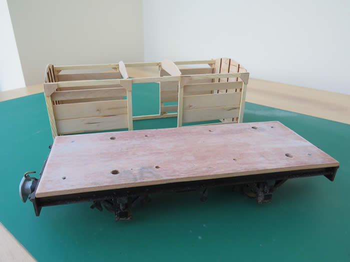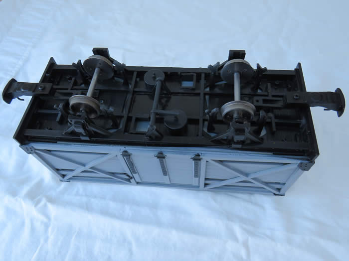 The GRS conversion method to make them appear British outline without the brake platform on each wagon involved using a hacksaw to cut into them diagonally across the centre of the LGB underframe producing one short section and the other longer with the flat walkway, brake and handrail. Two frames were cut in this fashion, the shorter halves were paired together and an LGB open truck body fitted nicely over this underframe with no modification.