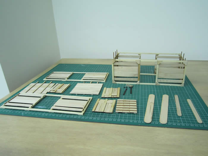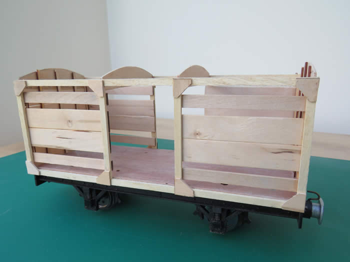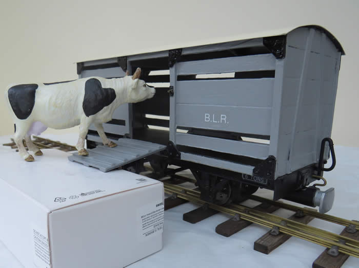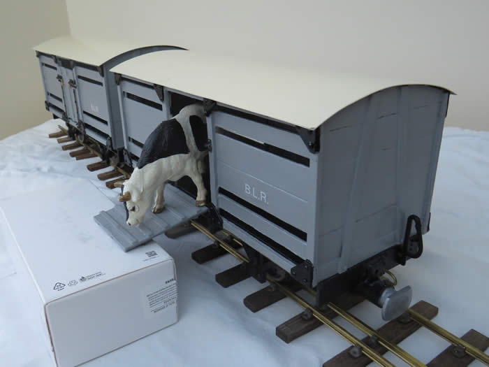 The two petrol tanks have been side-lined for now and lollipop sticks and some lengths of 5mm square wood section have been used to make two generic cattle truck bodies. The same grey paint was applied to the bodywork and the LGB writing on the frames was painted over and the labelling machine used again. Simple hinges and securing bolts have been made out of brass for the loading doors. The steel roofs were painted in antique white and are simply glued to the bodywork. The steel was formerly the front panel of a boiler, kindly donated by John a former 16mm’er. It also made roofs for two steel bodied carriages.