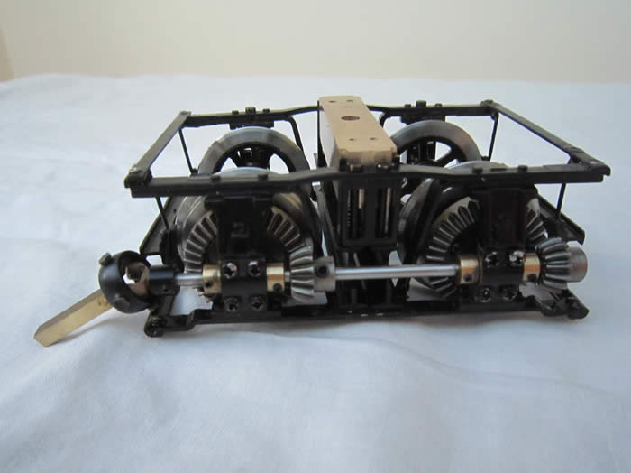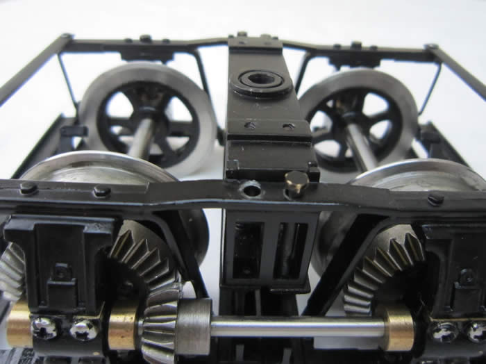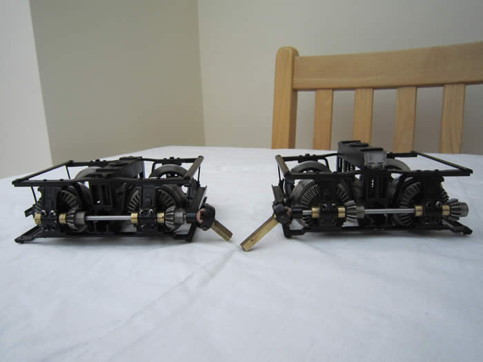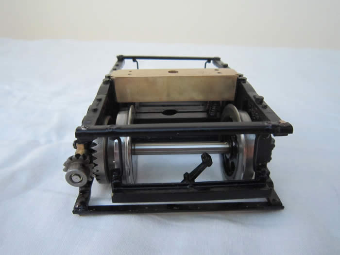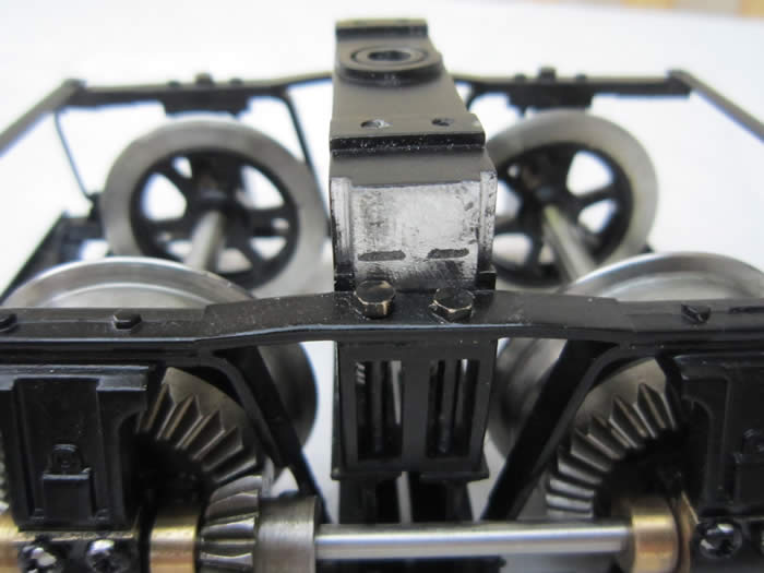 New spacers were made giving all the axles approximately 0.5mm of axial movement. When removing the wheels from the bogies, it was found that the upper central mounting box sections were both damaged, the vertical limiting lugs were either broken or missing with some of the debris stuck in the guide areas. On the rear truck the mounting box was jammed in the down position resulting in the top of the bogie frame rubbing on the tie bars for the firebox, removing paint and limiting the available movement. The front bogie was jammed in the up position by paint and debris on the tie screws. To sum up there was no flexibility between the bogies and the frame of the loco.