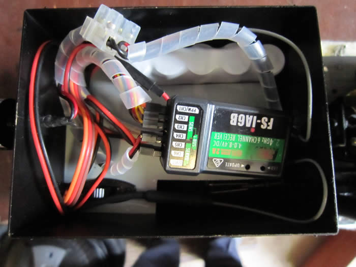 An Enots style water filler valve had been fitted to the steam turret. Therefore the oversized water pump was removed from the rear bunker because it was redundant. This left ample room for fitting the reversing servo, 6v. battery pack and the Flysky FSI-6B receiver which indicates the voltage on the transmitter screen. Two holes were drilled in the bunker for the reversing arm and the rear lamp power supply. The existing hole for the feed water pipe to the boiler was utilised for the two servo and lamp cables.