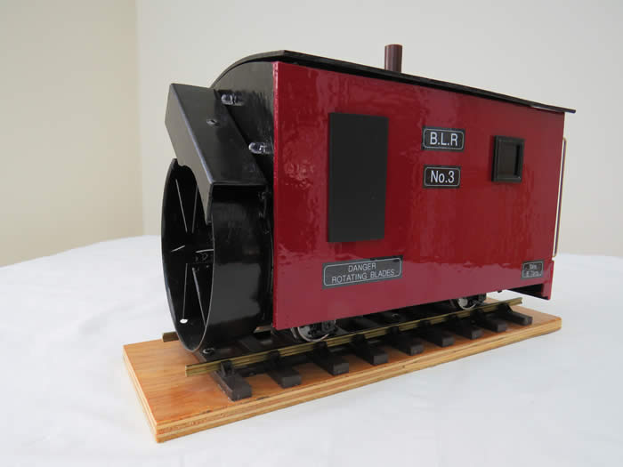 The casing was pop riveted to the front of the unit allowing a 1/32in. clearance of the rails. The adjustable foot was machined and drilled to suit the motor shaft and appropriate holes made in the fan casing and front panel for the drive shaft. The unit was test run at 6v. mainly to check the direction but had little power, stalling on 1ins. deep snow.