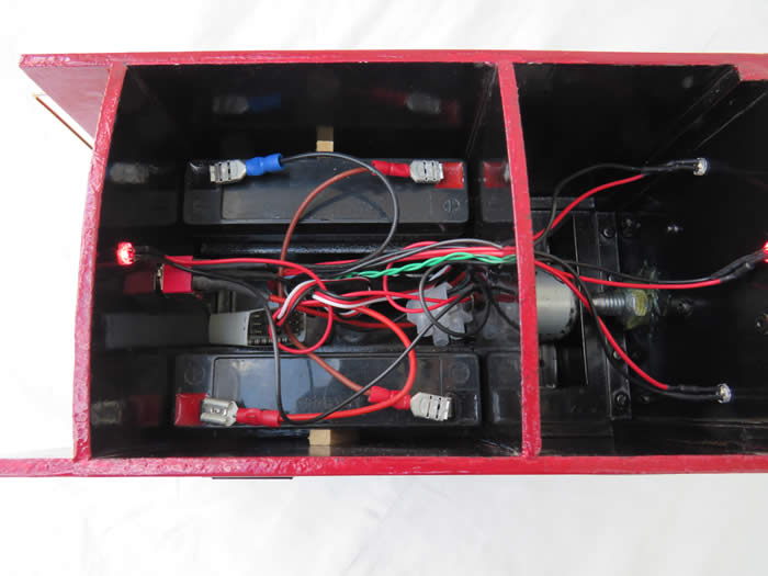 Once assembled and painted the unit seamed bland and boxy. A quick look on you tube at the ready built models and real life showed that with some minor additions to the sides and roof a more presentable model could be made. Again, the scrap box was raided for pieces to make windows, grills, funnel, vents and finally the label machine produced cheap decals.A Turnigy 20A. ESC was connected to the motor which is uni-directional and has a power supply to the Planet R6M receiver.