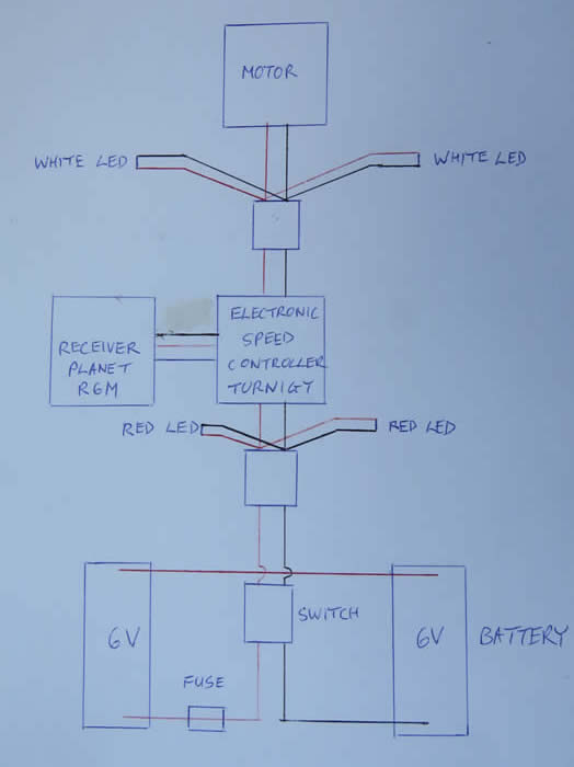 Warning 12v. red LEDs fore and aft illuminate when the power is switched on and additionally the 2 front facing white LEDs when the motor is running. Using the LHS throttle stick on the Planet T5 transmitter and channel 1 on the receiver the blower speed can be controlled to a stop whilst also fully controlling a battery loco on the RHS stick.