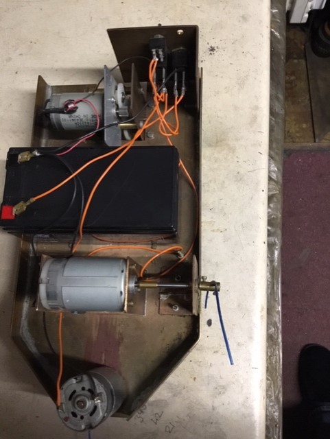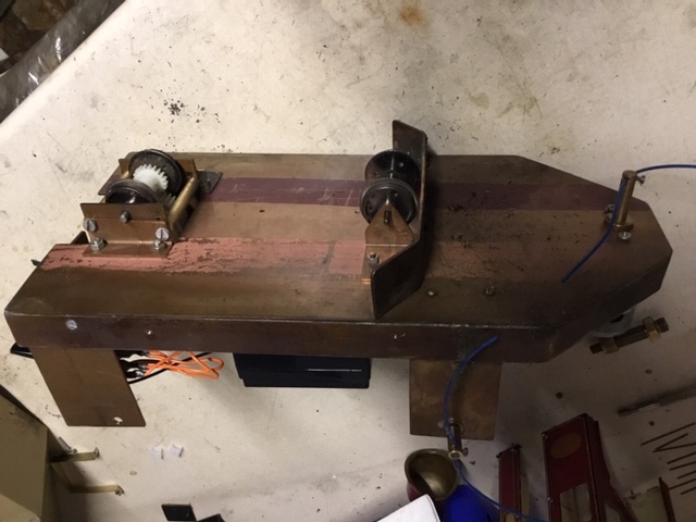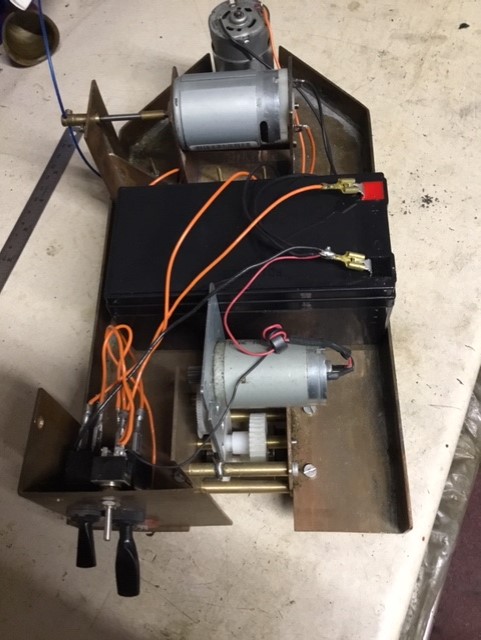 Nothing very sophisticated; an on/off switch for each motor, Accucraft spare wheels with the axles turned down for 32 gauge, the frame and brackets all cut out of a piece of bronze sheet I had, and the case from an old steel oil can.