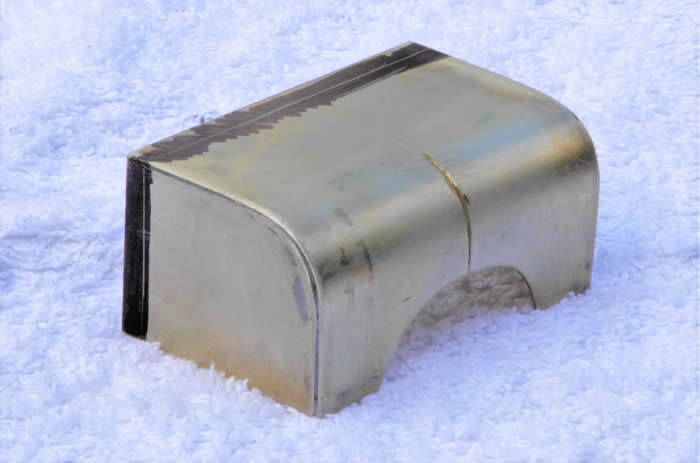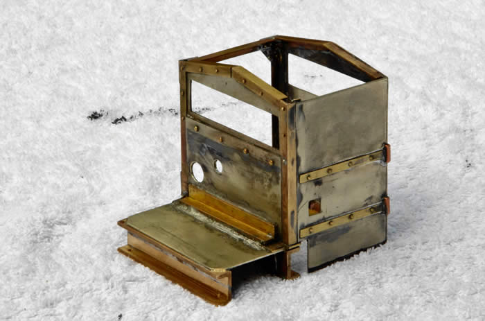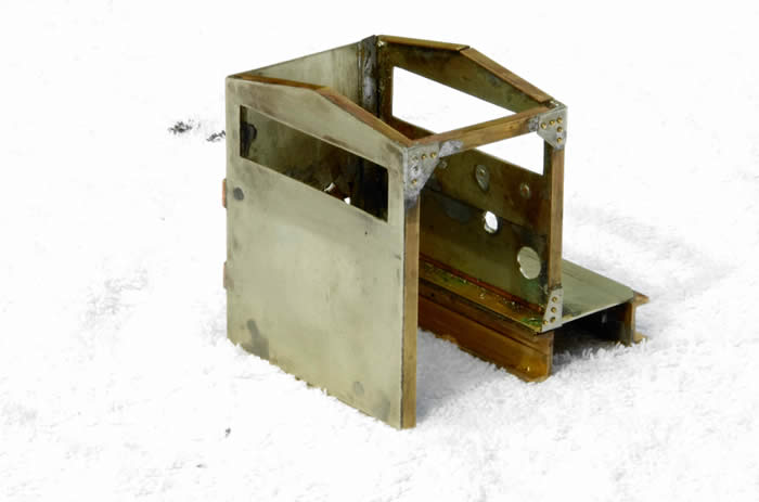 I like to build models in units to ease painting and future maintenance. Originally, I planned to build the cab and bonnet as separate assemblies but as the cab mounts to the bonnet frame I changed this to a single unit. Construction is again nickel silver sheet sheared and soldered using brass angle for the corners and for stiffening. Rivet and strip was added to give detail. The distinctive engine bearers were made from two pieces of heavy gauge angle soldered edge to edge with a stiffener. These with an angle in the cab back were drill and tapped to mount the unit to the footplate. The bonnet sides were shaped and this shape was used to bend a pair of square section stiffeners to shape. An over long piece of sheet was sheared to width and the bonnet radius formed with a piece of copper tube in the vice jaws. The lot was clamped and soldered, trimmed to length, the internal stiffener allowed the corner radius to be filed on the bonnet without weakening the joint. The distinctive cut-out in the front of the bonnet was formed with a drum sander in the Dremel.
