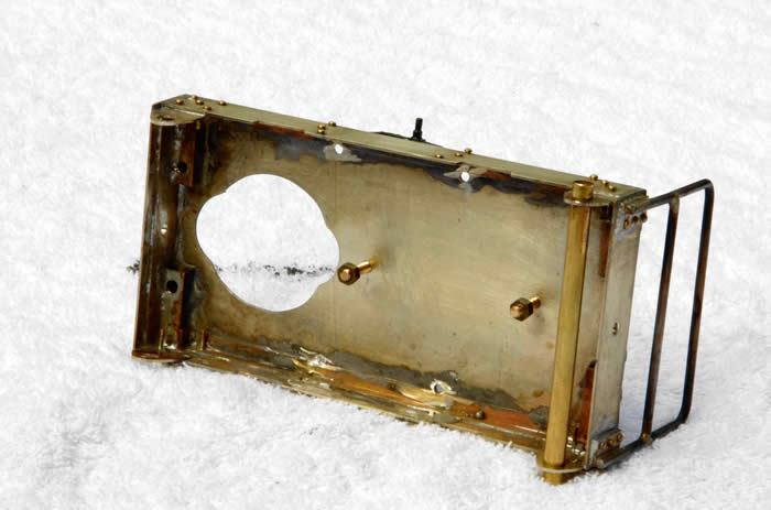 I retained the motor, gearing and wheels but the old chassis went. The new chassis consists of a piece of mild steel rectangular bar with two brass sides bolted to the edge of the steel bar. The brass sides are shaped to hide them from view and fitted with axle bushes. The motor had two brackets soldered to the can for mounting it to the mild steel bar which was drilled for the worm and mounting screws. Later if found necessary Delrin sprockets and chain can be fitted to give four-wheel drive.