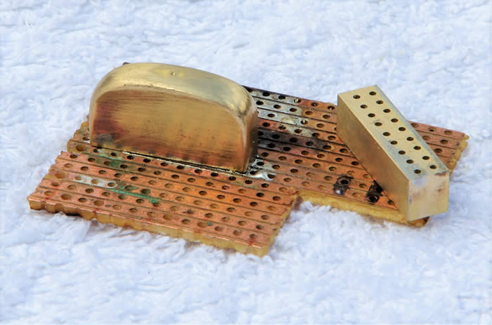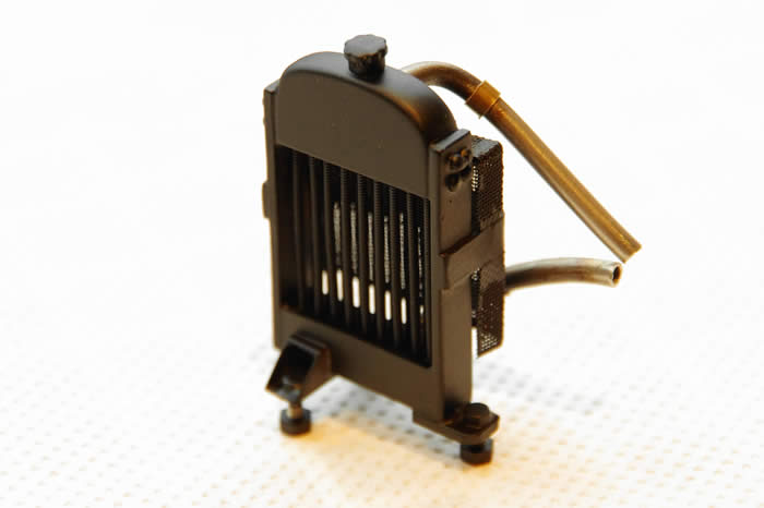 The transverse radiator is a prominent feature on a Simplex. The top and bottom headers were filed up from solid brass and, to aid drilling them for the radiator elements, they were soldered to copper clad Vero board. I drilled these before obtaining bass guitar strings to represent the Wignell element tubes so the spacing is a little too wide; the bottom header is through drilled to allow insertion of the strings. To save making a fan a mesh guard was made and soldered onto the back of the radiator. Brackets were made for the mountings to these 8ba screws were soldered to mount the radiator to the footboard.