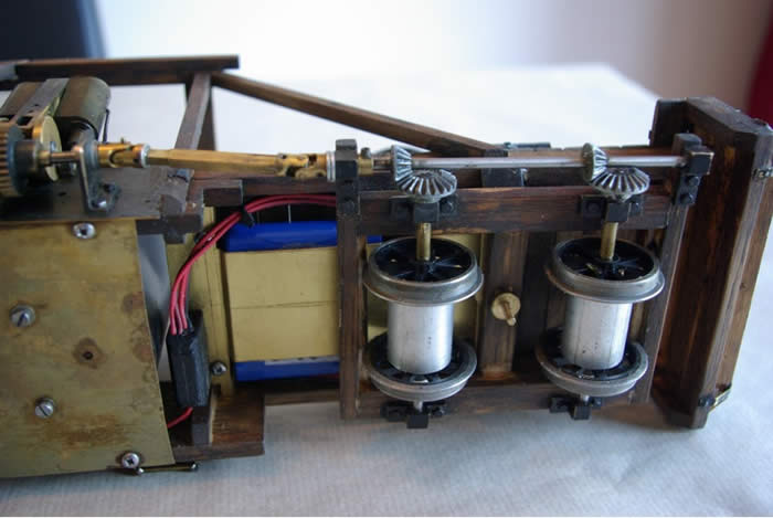 There, you can see the solid aluminium spacer in the middle of the wheels. This is grub screwed to the axles in the centre (just out if sight), and brass pegs are inserted in each flat end, so that they engage with the wheel spokes at both ends, hence driving the wheels.
