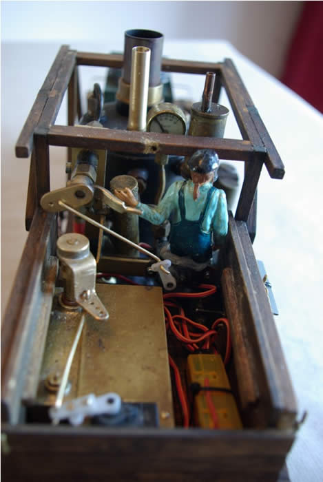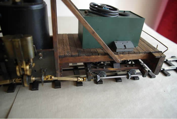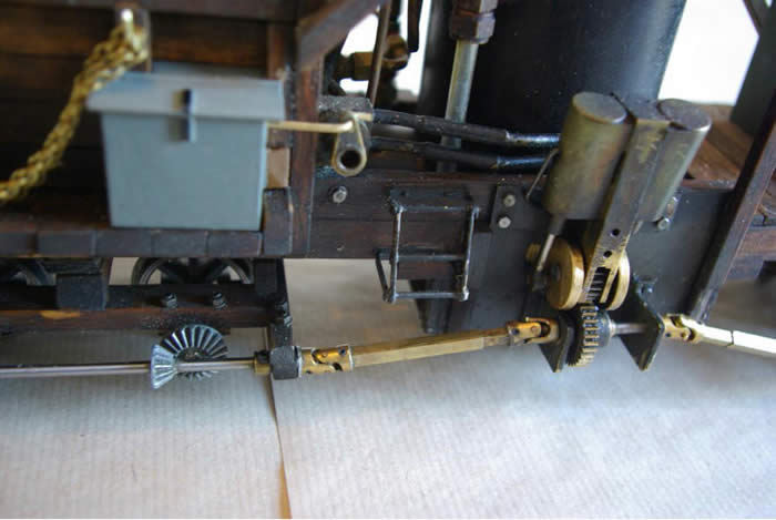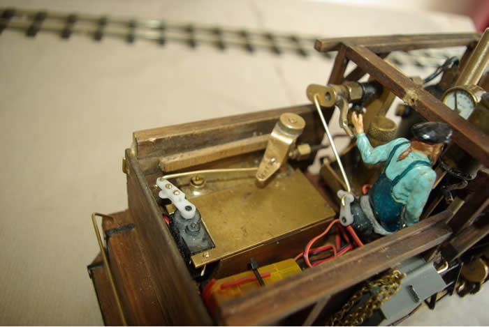 This loco was manually controlled, which doesn’t suit me, so firstly, three servos were fitted to control the usual functions of forward/reverse, regulator and gas valve control. Twas a tad tight but the only real difficulty was where to put the servo to operate the forward/reverse valve. The only place it would fit was behind and close to the valve, and this necessitated making an extra grey toolbox to cover it up, which I think looks OK.
