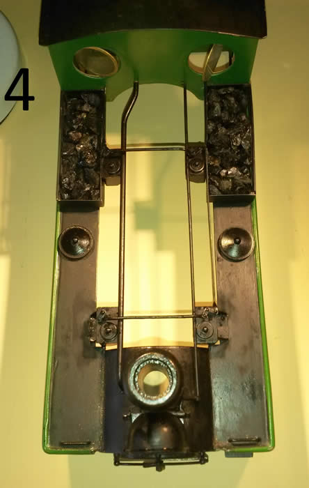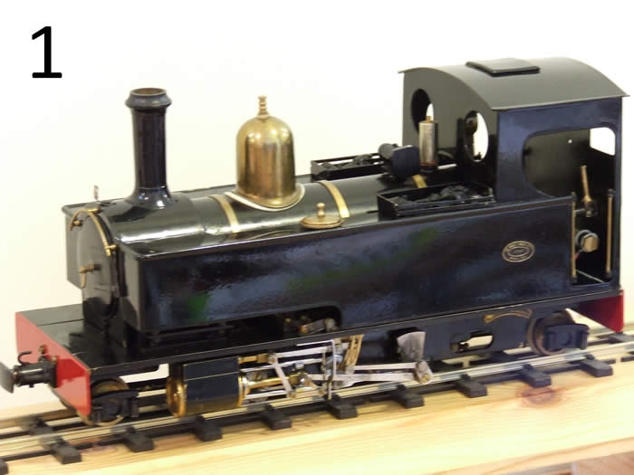 Regulator/Lubricator - On first steaming the boiler wouldn’t go above 30 psi (it’s designed for 50 psi) due to the combined regulator and lubricator leaking – it’s built from two pieces and the seal between the two was blown - also leaking oil and water/steam into the adjacent box containing the batteries and rc receiver! Truing of the mating surfaces and using liquid gasket cured this but steam was clearing leaking past the regulator which also suffered from sticking. The later was caused by a protruding roll pin but the former took some time to cure. The two circular surfaces forming the regulator were first under suspicion but when no amount of flatting the surfaces cured the problem further investigation was necessary. I discovered that steam was able to bypass the regulator because the hole for the outlet was too deep and breached the regulator shaft. This was fixed by making a lining for the regulator shaft and a new regulator rod – this also cured excessive wear in the fork at its end. Cylinders and valves – the engine had no compression when rotating by hand. Investigation showed that the pistons were plastic which I believe were original. Because of the design I imagine that with steam pressure they would seal to some extent but I decided to make new brass pistons with O rings. The next steaming blew the O rings on the inlet pipes and after these were replaced the piston valves leaked. Use of 640 steam oil reduced the leakage to a whisper on one side only but as luck would have it the opportunity came to purchase a brand new set of valves via Anything Narrow Gauge. Side rods – excessive wear in these was taken out by reaming the four offending holes round and bushing. Regulator servo – located at the front of the right hand tank the control rod was the length of the tank passing over the batteries and receiver and because of its length flexed. I relocated it next to regulator and pushed the electrics forward. Radio – the loco came with a 27 mhz rc which I replaced with a 2.4 ghz set.